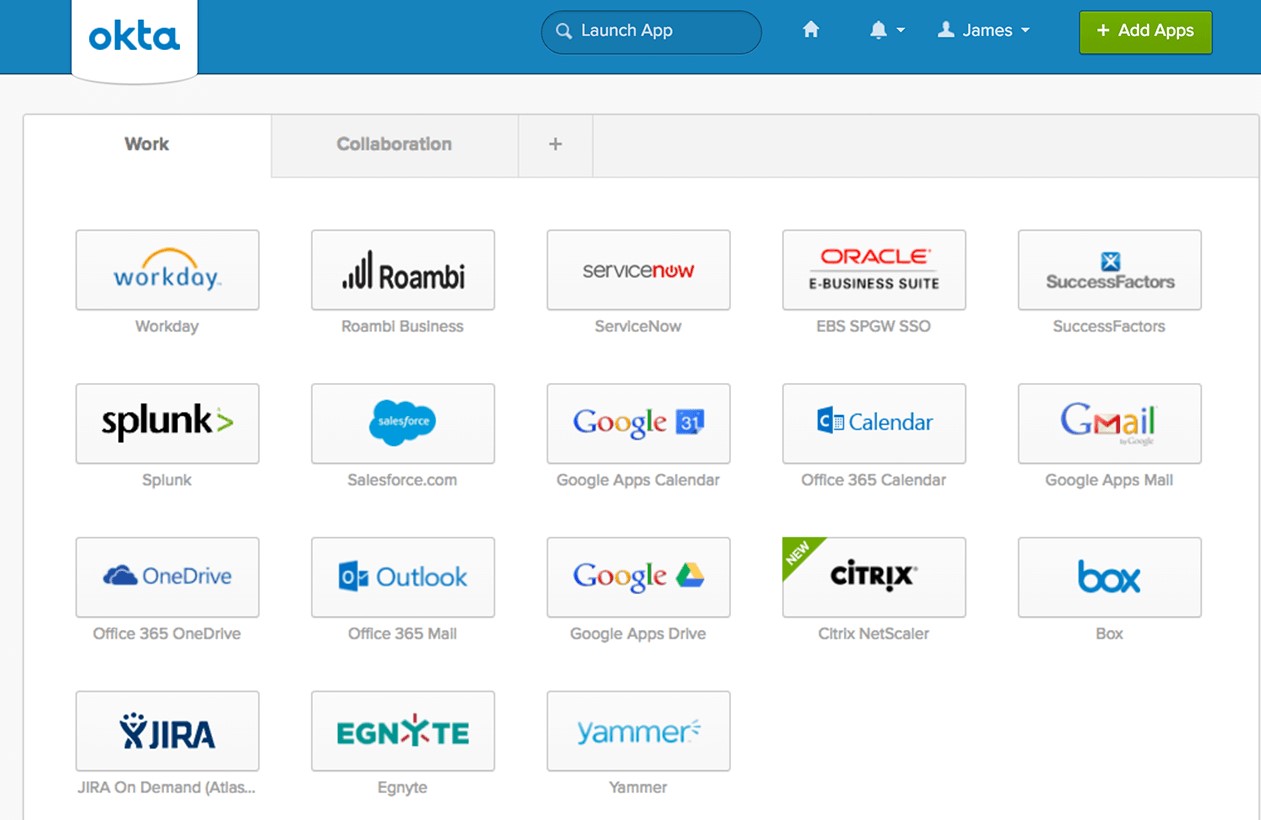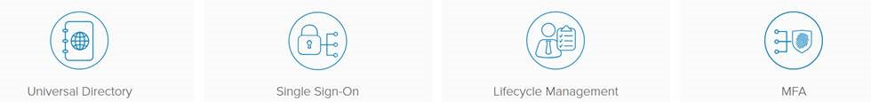 SSO) Single Sign On) – מערכת הזדהות אחודה לכל אפליקציה שבאה במגע עם הארגון ומחוצה לו. קיימת אינטגרציה בחנות של Okta עם למעלה מ-6000 אפליקציות מוכנות לשימוש. משתמש הקצה מקבל פורטל ארגוני המכיל את האפליקציות שאליו הינו מורשה, עם ההרשאות המתאימות אליו לפי Role/Security Groups.